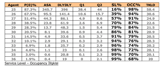 Daha iyi service level istenildiğinde (daha yüksek Service Level), kural gereği Occupancy (doluluk) düşecektir. Bu şu demektir: Daha iyi hizmet sunmak istiyorsan, bil ki Agent’lar daha fazla “boş oturuyor” olacaklar.