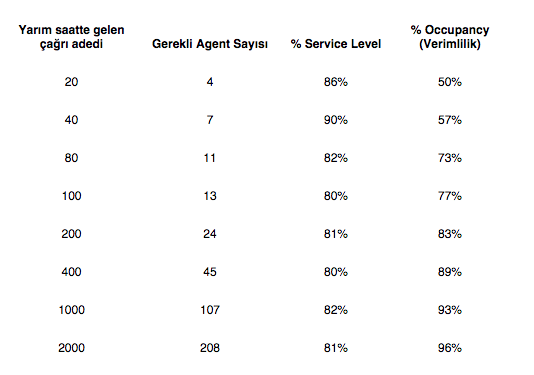 Aşağıdaki tabloda, çağrıların ortalama ele alma süresi (average handling time) 180 saniye olan ve service level hedefi %80’e 20 saniye olan ve farklı sayıda çağrı alan çağrı merkezlerinin durumu gösterilmektedir.